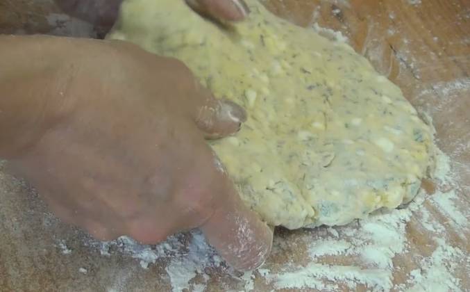 2. Всё делается довольно быстро. Тесто получается довольно липким. Обильно посыпаем стол мукой. Руки тоже посыпаем мукой. Перекладываем на муку тесто. Посыпаем мукой. Делим тесто пополам. Из каждой части мы будем делать лепёшку. Обваливаем в муке. Лепёшка должна быть круглой, толщиной 1-1,5 см. Не толще. Скалкой раскатывать тесто не надо, потому что оно довольно мягкое, живое. Разогретую сковороду смазываем растительным маслом. Эти лепёшки можно выпекать в духовке. Разрезаем ножом тесто.