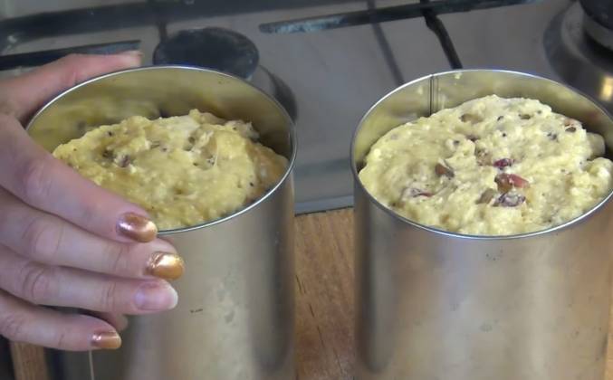 3.  На дно кладём пергаментную бумагу, смазанную растительным маслом. Немного смазываем руки подсолнечным маслом. Наполняем тестом формы для выпечки наполовину. Оставляем тесто подниматься на 30 минут. Тесто хорошо поднялось. Выпекаем в предварительно разогретой до 160°C/320°F духовке. Ориентируйтесь по своей духовке. Готовность куличей проверяем при помощи деревянной палочки. Достаём кулич из духовки. Если палочка сухая, значит кулич готов. Накрываем полотенцем и оставляем остывать. Куличи готовы. Будем их украшать. Они получаются мягкими, воздушными. Буду использовать готовую шоколадную глазурь.