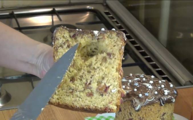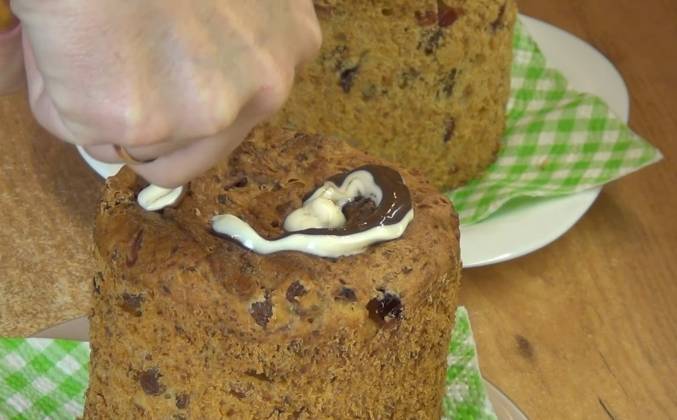 4.  Глазурь можно приготовить самим, используя сахарную пудру, белок или лимонный сок. На 1 стакан сахарной пудры - 1 белок или 2-3 столовых ложки лимонного сока. Наносим сверху глазурь. Сверху украшаем присыпкой. Давайте посмотрим, какой получился кулич на срезе. Очень мягенький, нежный. Даже пустота образовалась. Хочу попробовать кусочек. Глазурь ещё не застыла, потому что я сразу решила снять пробу. Такой мягкий. Кулич мягкий, приятный, влажный, но не сырой. Мне очень понравилось мягкое тесто. Готовьте с удовольствием и светлой вам Пасхи!Видео рецепт ютуб ниже 👇