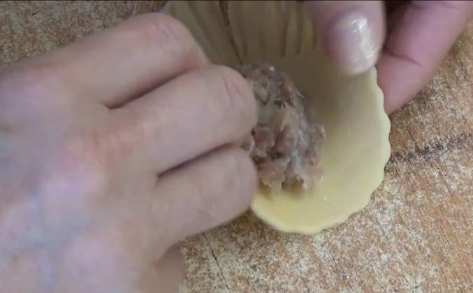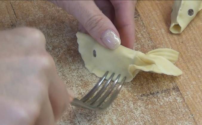 3. Чем больше разрез, тем длиннее хвостик. Нужно учитывать, что здесь ещё будет начинка. Делаем вилкой полосочки. Кладём начинку. Количество начинки - как на пельмени. Делаем глазки. Остаются у нас кружочки. Соединяем края. Оставляем маленькое отверстие - это ротик рыбки. Края хорошо защипляем. Хвостик разворачиваем. Придавливаем хвостик у основания палочками. Поправляем вилкой. Наносим вилкой рисунок. Делаем рыбке плавнички. Получается миниатюрная рыбка. Теперь сделаем рыбку с глазками-кружочками. Снова слегка вытягиваем тесто. Прикрепляем глазки при помощи воды. Дальше всё, как у первой рыбки. Будем готовить в пароварке.