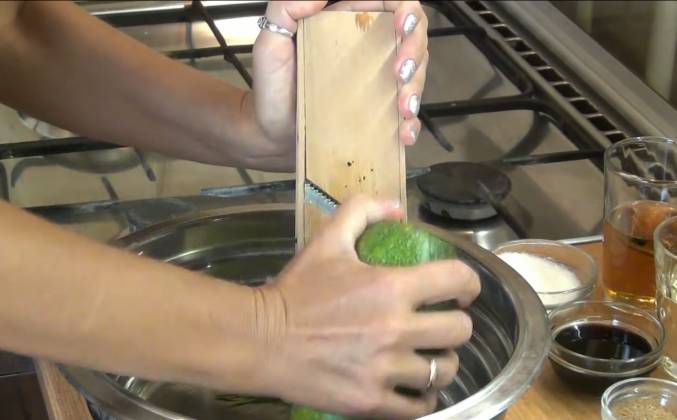 Салат кабачков моркови - салат "Овощная лапша". Это интересное кушанье готовится из кабачков, моркови и огурцов. В сезон свежих овощей не составит труда приготовить такой салатик. Делается всё просто и недорого. Для рецепта берём: 1 кабачок, 2 моркови, 2 огурца, зелень петрушки или укропа; 100 мл яблочного уксуса (6%), 100 мл нерафинированного растительного масла, 3 ст.ложки соевого соуса, 1 ст.ложка сахара, 1 ч.ложка молотого кориандра. Можно добавить чеснок или лук.