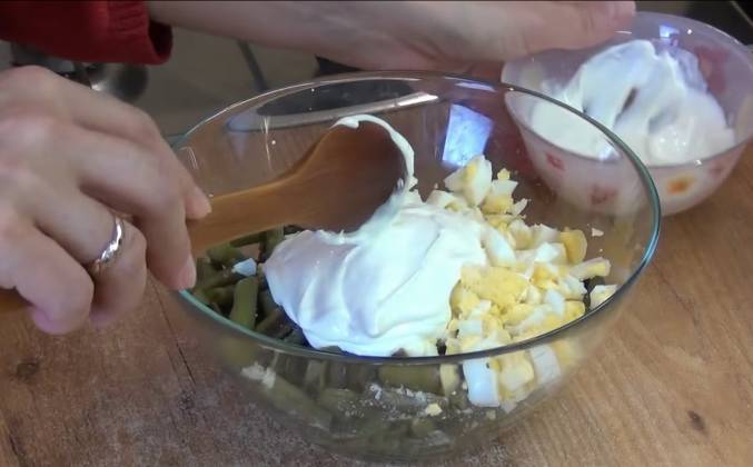 3. Оставляем остывать. Фасоль и яйца остыли. Добавляем к ним выдавленный через пресс чеснок. Добавляем нарезанные кубиками яйца. Солим. Заправляем сметаной и хорошо всё перемешиваем. Сытный и вкусный салат из стручковой фасоли станет отличным к обеду или ужину.Видео рецепт ютуб ниже 👇