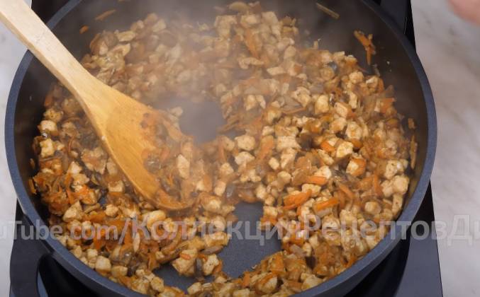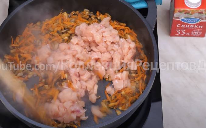 2.  Как только грибочки станут золотистыми, добавляем к ним одну среднюю морковь, измельченную на крупной терке, все перемешиваем и тушим до мягкости моркови. К овощам добавляем 500 г куриного филе или другого куриного или индюшиного мяса, порезанного очень мелкими кусочками, или куриный фарш. Постоянно мешая, не убавляя нагрев, обжариваем пока филе полностью побелеет. По вкусу добавляем соль и перец, смешиваем и как только в сковороде не останется мясного сока, всыпаем 1 ст.л. муки и обжариваем вместе с мукой. Вливаем сливки или добавляем сметану и немного тушим. 3.  Количество сливок корректируйте на месте - нам нужна густая и при этом сочная начинка. В этот момент нагрев убавляем и даем начинке загустеть, она должна быть вязкой. В результате я использовала не менее 100 г сливок. После остывания, начинка станет еще гуще. Попробуйте ее на свой вкус и при необходимости добавьте соль и, если хотите, зелень. Как и в предыдущем рецепте, по желанию начинку можно пропустить через мясорубку, чтобы получить более однородную текстуру.