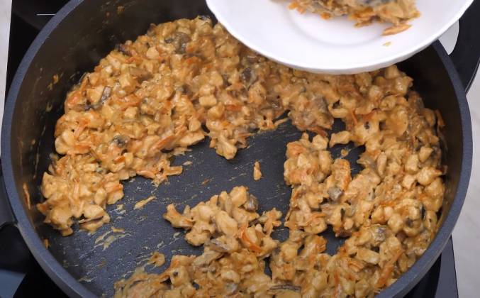 2.  Как только грибочки станут золотистыми, добавляем к ним одну среднюю морковь, измельченную на крупной терке, все перемешиваем и тушим до мягкости моркови. К овощам добавляем 500 г куриного филе или другого куриного или индюшиного мяса, порезанного очень мелкими кусочками, или куриный фарш. Постоянно мешая, не убавляя нагрев, обжариваем пока филе полностью побелеет. По вкусу добавляем соль и перец, смешиваем и как только в сковороде не останется мясного сока, всыпаем 1 ст.л. муки и обжариваем вместе с мукой. Вливаем сливки или добавляем сметану и немного тушим.