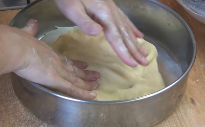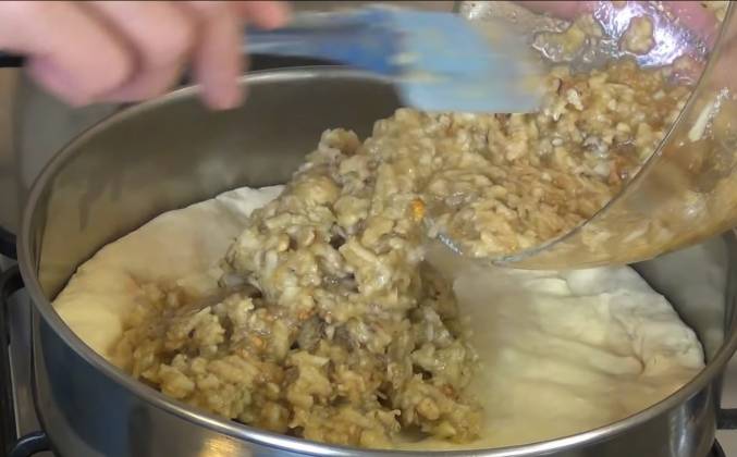 2. Я сделаю из теста "лепёшку". Вытягиваем тесто, делая небольшой бортик. Готово! Ставим выпекаться в разогретую до 180°С / 360°Fдуховку на 20-25 минут. Пока готовится тесто, занимаемся начинкой. Очищаем яблоки от кожуры и натираем их на крупной тёрке. Измельчаем орехи. Добавляем их к яблокам. Добавляем ванильный сахар и корицу. 100 г сахара и всё перемешиваем. Через 20 минут проверяем тесто. Оно немного приподнялось и уже не сырое. Распределяем начинку по поверхности пирога. Начинку лучше не готовить заранее, чтобы она не потекла.