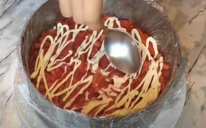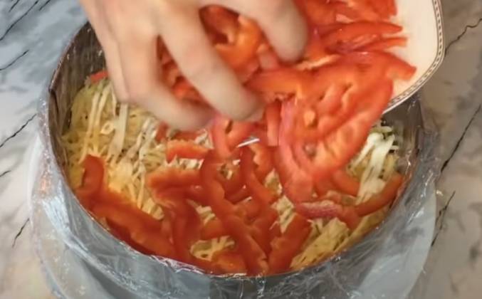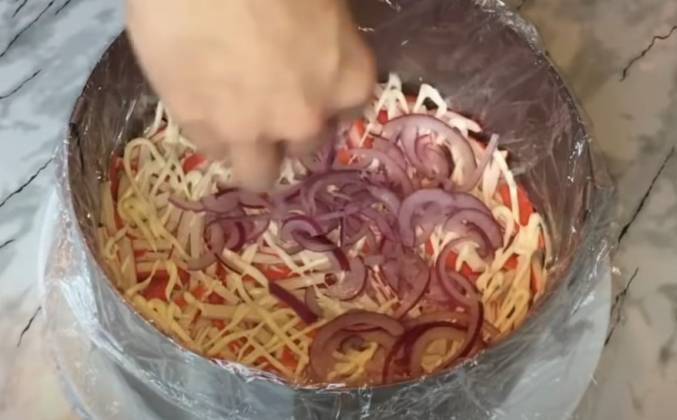 3. И следующий слой это лук. С лука я заранее отжала полностью всю жидкость. Далее идут помидоры, которые нужно немножко посолить и смазать майонезом. Следующий слой, сыр, который смазываю майонезом. И последний завершающий слой это болгарский перец. Салат в таком виде отправляем в холодильник как минимум на один час. Салат "Красное Море" Готов!!! Салат получился Ярким Красивым, Сочным и Очень Вкусным. А я надеюсь вам понравился рецепт приготовления салата и вы его приготовите.Видео рецепт ютуб ниже 👇