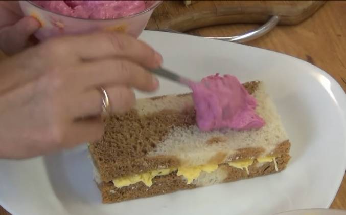 2. Добавляем подтаявшее сливочное масло. Хорошо всё это перетираем. Должна получиться такая однородная сырковая поста. Если у вас нет мощного блендера, то надо творог перетереть через мелкое сито. Затем смешать его с подтаявшим сливочным маслом. Добавляем сюда кусочек сваренной свёклы. Можно использовать свекольный сок. Чеснок можно выдавить через пресс или перемолоть при помощи блендера. Получается вот такая красивая начинка. Эту начинку нужно обязательно посолить. По вкусу. Смешиваем. Срезаем с хлеба все корочки. Нарезаем хлеб тонкими ломтиками. Начинаем формировать торт. Берём ломтик хлеба. Выкладываем на него любую приготовленную начинку. У меня будет внизу жёлтая начинка. Выкладываем начинку и выравниваем её.