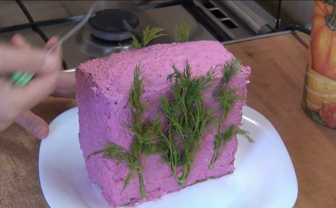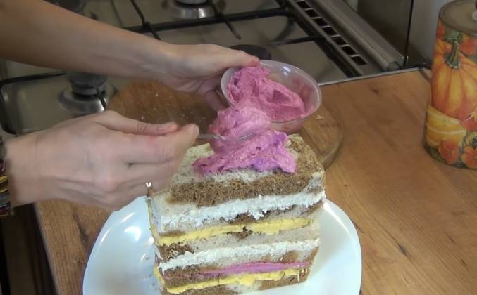 3. Сверху - ломтик хлеба. Прижимаем. Используем розовую начинку. Начинку не жалеем. Выкладываем её много. Слой жёлтой начинки. Будет ещё слой из белой начинки. Сверху торт будем покрывать розовой начинкой. Вся жёлтая начинка уходит на этот слой. Розовой начинкой покрываем торт сверху и со всех боков. У нас будет розовый торт. Придумала, как удобно оформить торт. Протыкаем его шпажкой и наносим крем сверху. И руки остаются чистыми, и торт не ломается. Наносим плотный слой крема. Убираем торт пропитываться на 2 часа в холодильник. Застывший торт украшаем свежей зеленью. Можно использовать укроп, петрушку, перья лука. Можно укроп мелко порубить и посыпать им сверху торт. Выравниваем крем сверху. Украшаем торт клюквой. Вот такой вот у меня получился красивый закусочный тортик. Конечно, надо вам показать, какой он в разрезе. Берём острый нож. Аккуратно. Как настоящий торт! Красиво получается!Видео рецепт ютуб ниже 👇