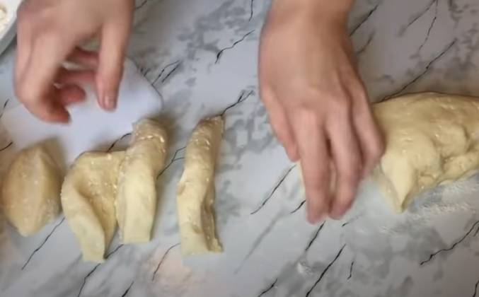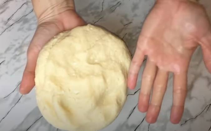 2. Оно получается мягким, эластичным, очень нежным и оно совершенно не липнет к рукам. Вы лучше ориентируйтесь по самому тесту так как у каждого разный творог. Может вам понадобиться немножко меньше муки или немножко больше. На время приготовления начинки тесто пока откладываю. Для начинки, с яблок я срезала кожуру, удалила семечки, яблоки нужно мелко нарезать. К нарезанным яблоком добавляю промытый изюм, Сахар, Корицу и все перемешиваю. Начинка готова, теперь можно формировать пирожки. Тесто нужно разделить на 10 равных частей. Рабочую поверхность нужно немножко присыпать мукой. Беру один кусочек теста. И из этого теста формирую лепешку толщиной приблизительно 2 3 миллиметра.