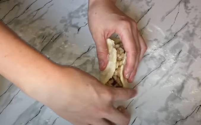 3. В центр выкладываю начинку. И формируем пирожок защипываем края. И вот таким вот образом я сформирую все остальные пирожки. Пирожки я все сформировала я их выложила швом вниз на противень который застелила пергаментной бумагой. Сверху пирожки нужно немножко смазать взболтанным яйцом. Пирожки отправляем выпекаться в разогретую духовку до 180 градусов. Буду выпекать приблизительно 20-30 минут. Пироги я испекла. Они у меня подрумянились. Вы лучше ориентируйтесь по самим пирогам так как у каждого разные духовки и по-разному они выпекают. Теперь не могу с уверенностью сказать что Пироги с Яблоками Готовы!!!