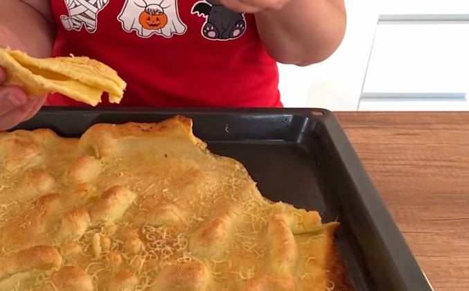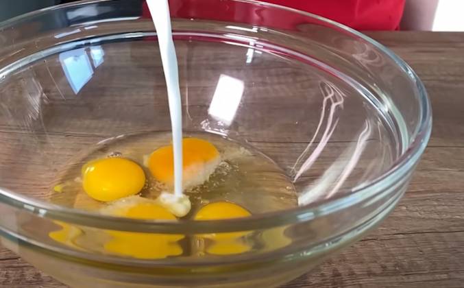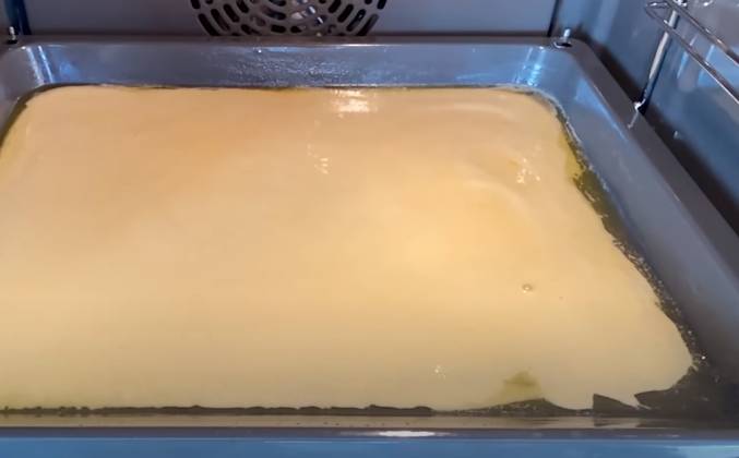 2. Горячий противень смажем маслом 30 гр и выливаем туда яичную смесь. Выпекаем в 2 этапа: 250 градусов - 10 минут, 180 градусов - 15 минут. Готовое блюдо можно припудрить сахарной пудрой, но мы сделаем его соленым.Видео рецепт ютуб ниже 👇