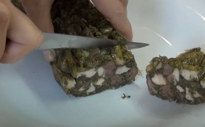 3. Для надежности зафиксируем рулет веревочкой. Убираем его в холодильник застывать на 4 часа, а лучше это сделать на ночь. Разворачиваем и смотрим что у нас получилось. Благодаря желатину, все кусочки соединились в рулет. Надо рулет разрезать и посмотреть, как он выглядит внутри. Режется хорошо. Получился красивым. Тут и белое мясо, и красное мясо. Получился такой нарядный рулет. Готовьте с удовольствием и приятного вам аппетита!Видео рецепт ютуб ниже 👇