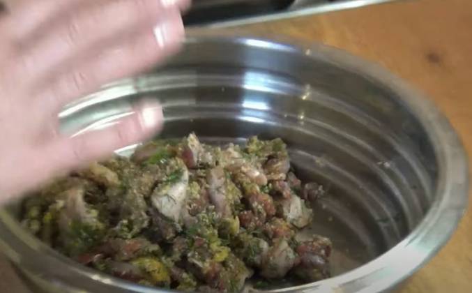 Куриный рулет мраморный в духовке. Для рецепта берём: домашнюю курицу, сушёные специи - хмели-сунели, лук, петрушка, пучок свежего укропа, 1 зубок чеснока, 1 ч.ложка чёрного молотого перца, соль по вкусу и 30 г быстрорастворимого желатина.