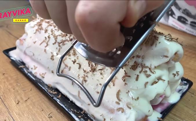 3. Следующий слой выкладываем по 2 палочки, крем и вишни снова сверху. Последний слой делаем из 1 палочки и покрываем кремом. Ставим торт в холодильник на 1 час. Разравниваем края и сверху натрем шоколадную стружку. Торт. Монастырская изба готов! Приятного аппетита!Видео рецепт ютуб ниже 👇