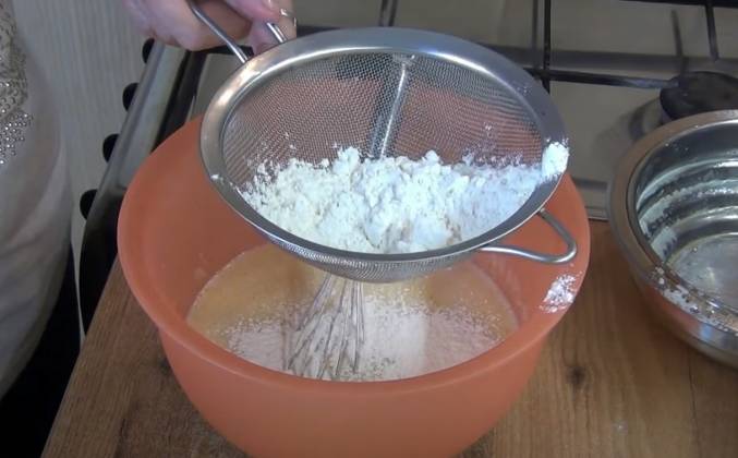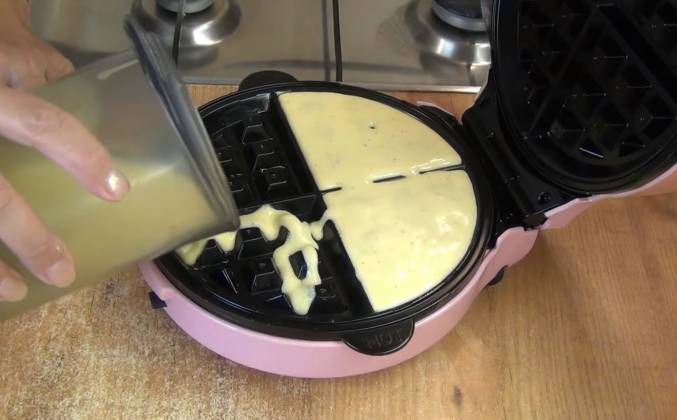 2. Хорошо перемешиваем. Берём сито. Постепенно добавляем муку, крахмал и разрыхлитель. Просеиваем через сито. Вот такое получается тесто. Довольно жидкое. Наливаем тесто в смазанную сливочным маслом и разогретую вафельницу. Запекаем 7-10 минут.