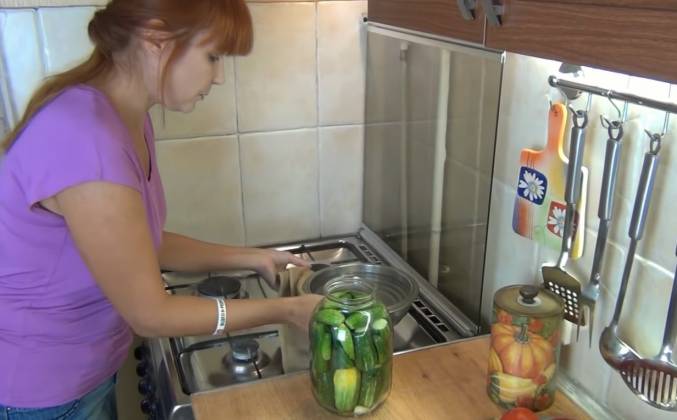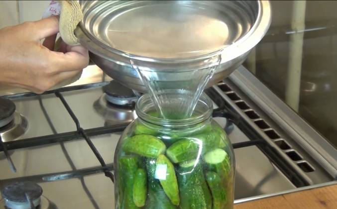 2. Накрываем крышкой и оставляем на 15 минут. Пока стерилизуются огурчики, надо сделать томатный сок. Делаем это любым удобным для вас способом. Я буду делать томатный сок при помощи соковыжималки. Через 15 минут можно сливать воду. Выливаем обратно в миску. Доводим до кипения. Закипевшей водой снова заливаем огурцы. Оставляем остывать на 30-40 минут. Баночка должна стать тёплой, чтобы спокойно можно было взять её руками. Накрываем крышкой. Снова сливаем воду. Может хватить и 2 заливки водой, но я рекомендую сделать 3 заливки. Поэтому снова доводим воду до кипения. Потом наливаем её в банку и даём остыть в течение 40-45 минут.