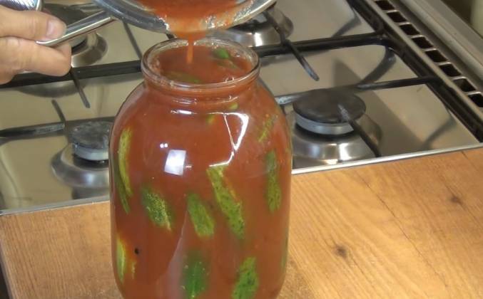 3. Третий раз заливаем огурцы водой. Пока огурцы стерилизуются, сварим томатный сок. Доводим сок до кипения, кипятим 10 минут и снимаем пену. Сливаем воду. В кипящий томатный сок добавляем 2 ст.ложки соли без горки. На 2-литровую банку с огурцами понадобится около 1 литра томатного сока. Вторая. Перемешиваем, чтобы растворилась соль. Даём покипеть ещё 2-3 минуты. Готовым соком заливаем огурцы. Уксус сюда мы не добавляем. Осталось немного томатного сока. Закатываем банку крышкой. Банку с огурцами переворачиваем, ставим в тёплое место, хорошо укутываем и оставляем так до полного остывания. Остывшую банку переворачиваем обратно и храним при комнатной температуре в кладовке.Видео рецепт ютуб ниже 👇