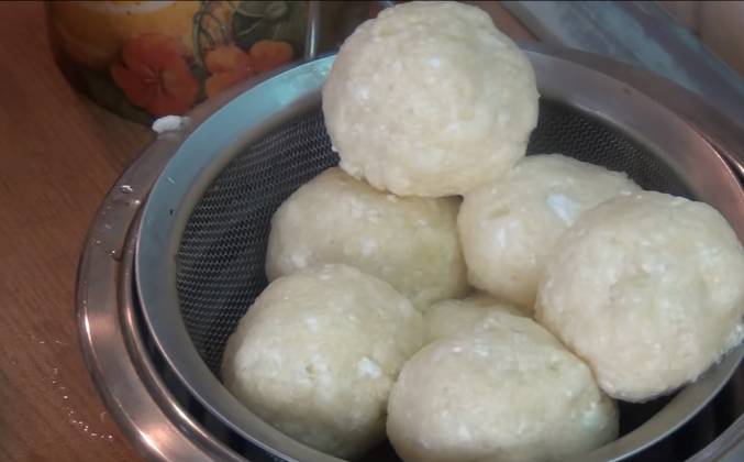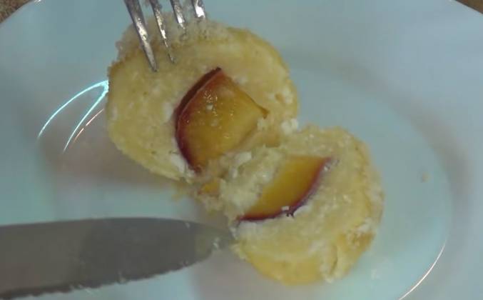 2. Нагреваем воду до кипения. Делим персик на 8 частей и удаляем косточку. Делаем это аккуратно. Смачиваем руки в холодной воде. Берём немного творожного теста. Скатываем из него шарик. Размер выбираете сами, какой вам больше нравится Берём кусочек персика. Можно нарезать персик на более мелкие кусочки. Формируем шарик с начинкой. Начинку не должно быть видно. Погружаем шарик в кипящую воду. После того, как шарики всплыли, варим их 5 минут и достаём из воды. Кладём их на сито, чтобы стекла лишняя влага.