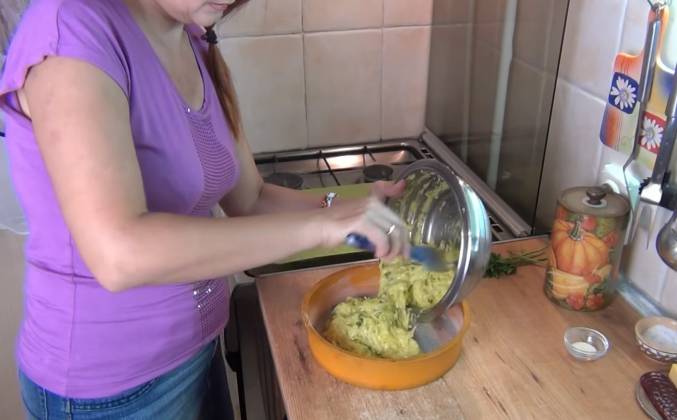 2. Всё хорошо перемешиваем. Делаем тесто, как для кабачковых оладий. Форму для выпечки смазываем сливочным маслом и посыпаем манкой или панировочными сухарями. Перекладываем кабачковое тесто в форму для выпечки. Чтобы было меньше сока, можно подольше подождать, когда он стечёт из кабачков.. Выравниваем. Получилась основа для пиццы. Дальше пиццу можно украшать на свой вкус. Можно добавить колбасу, мясо... Я сделаю половину пиццы с помидорами, половину - с колбасой.