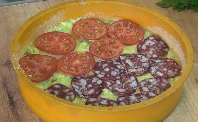 Здравствуйте! Меня зовут Елена Баженова. Рада вас приветствовать у себя в гостях! Сегодня мой рецепт - для любителей кабачков. Предлагаю приготовить интересное, простое и вкусное блюдо из доступных продуктов. Кабачковая пицца - это запеканка, нежная и вкусная. Пиццу она напоминает только внешне. Для рецепта берём: 600 г кабачков, 1 помидор, 1/2 ч.ложки соли, 1 ст.ложка манки, 2 ст.ложки муки, 20 г сливочного масла, 1 ч.ложка разрыхлителя, 3 яйца, 100 г сыра, 1 пучок петрушки, Можно добавить колбасу. .