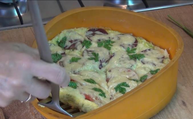 3. Этим она и напоминает пиццу. Ставим пиццу запекаться в разогретую до 180°С/360°F духовку. За 5 минут до готовности пиццы нужно её сверху посыпать тёртым сыром. Натираем сыр на крупной тёрке. Кабачковая пицца запекалась около 30 минут. Оставляем её немного остывать. Пицца получается очень нежной. Достать её из формы для выпечки и не сломать сложно. Поэтому я нарежу пиццу прямо в форме для выпечки. Аккуратно достаём. Получилось! Такой вот нежный, красивый кусочек пиццы.Видео рецепт ютуб ниже 👇