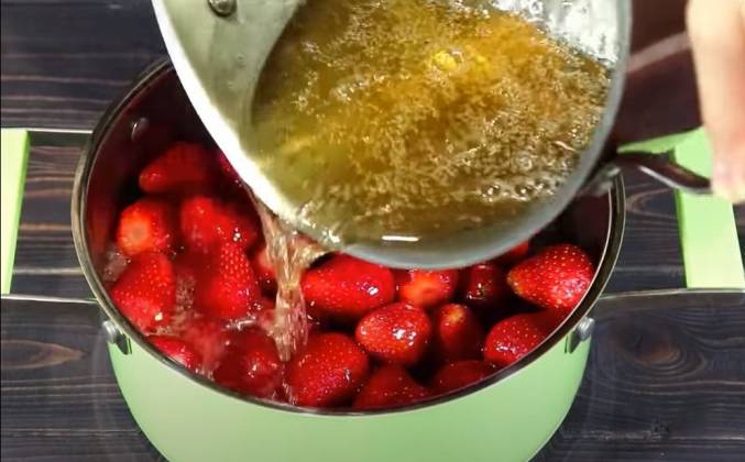 3. Процеживаем, выливаем сироп обратно в кастрюлю ставим на плиту варить ещё на 10 минут. Ягоды выкладываем обратно в кастрюлю, снова заливаем этим сиропом клубнику и оставляем на 15-20 минут. Последний раз переливаем сироп в кастрюлю и снова ставим на плиту варить, но только уже на 5 минут.