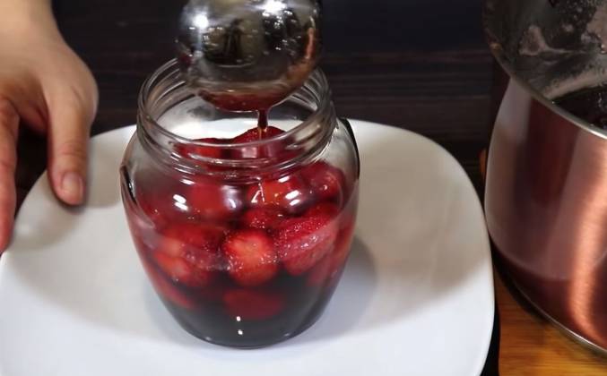 4. Пока закипает сироп, ягоды укладываем в банки. Банки я простерилизовала в духовом шкафу, при температуре 100 градусов 10 минут. Заполняем их ягодами наполовину. Сироп через 5 минут снимаем с плиты, убираем пенку и заливаем этим сиропом ягоды. Из данного количества ингредиентов выходит 1 литр 300 миллилитров клубничного варенья. Плотно закрываем крышками, которые я заранее прокипятила.Видео рецепт ютуб ниже 👇