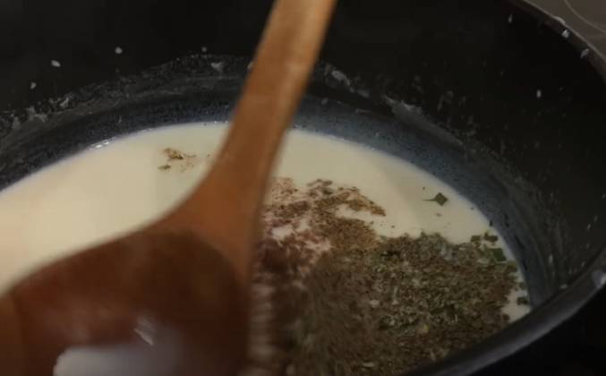 2. В остаток молока добавьте соль и мускатный орех. Я еще добавляю итальянские травы и молотый чёрный перец. 1-й раз будете делать соус «Бешамель» - очень надо быстро перемешивать. Мешайте венчиком - не будет комочков. Очень быстро и просто! Если боитесь, что венчиком не получится - взбивайте миксером. Важно использовать именно силиконовый венчик.