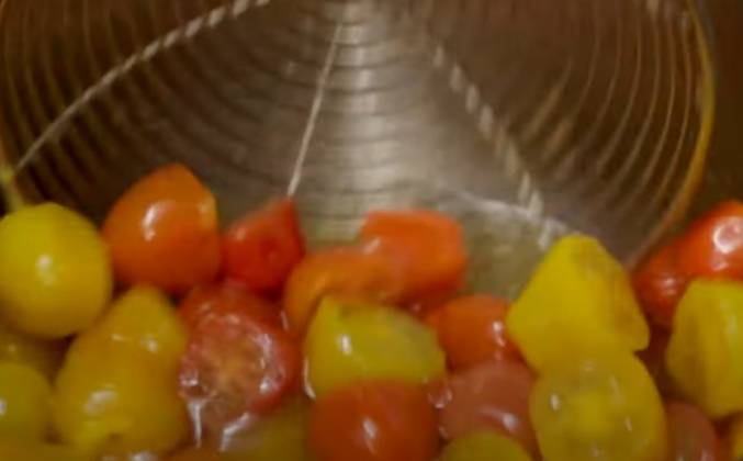 3. Отрегулируйте нагрев, чтобы все время было небольшое кипение. Обжаривать баклажаны до легкой золотинки и выкладывать на бумажную салфетку. Также и со следующей партией. Когда закончили обжаривать баклажаны выключить нагрев под маслом. Очень быстро и аккуратно опустите в него помидоры и сразу же доставайте. Обжаренные баклажаны и ошпаренные помидоры выложить в одну салатницу. Добавить подготовленную заправку и аккуратно перемешать. На этом салат готов. Его подают в теплом виде.Видео рецепт ютуб ниже 👇