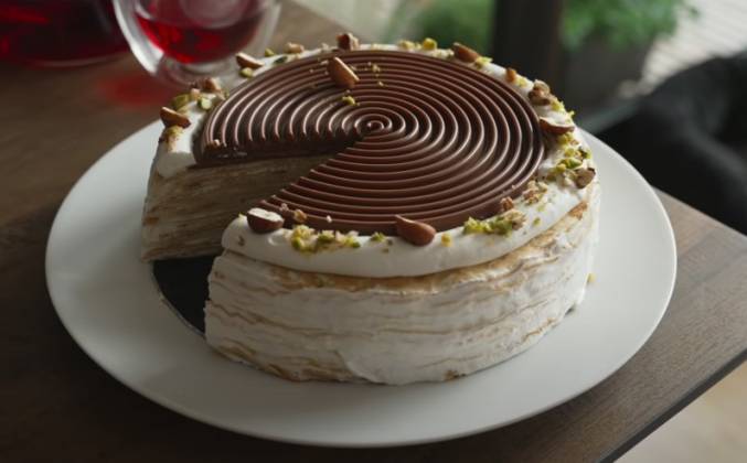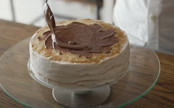 1. Сегодня мы будем готовить блинный торт по-французски. Блины, которые я купил в кондитерской в Париже были вкусными, вкус был похож на пирожное канеле. И сегодня мы сделаем торт из блинов. Я купил на рынке молоко, оливковое масло, яйца и сливочное масло. Перед тем как начать делать блины, мы приготовим пасту Джандуйя, которая будет украшать торт сверху. Помещаем фундук в духовку на 30-40 минут при температуре 150℃. Кладем в блендер сахар и орехи и доводим до пастообразного состояния. Чтобы охлажденная паста Джандуйя не затвердела, добавьте оливковое масло. Затем надо смешать пасту Джандуйя и размягченный молочный шоколад.