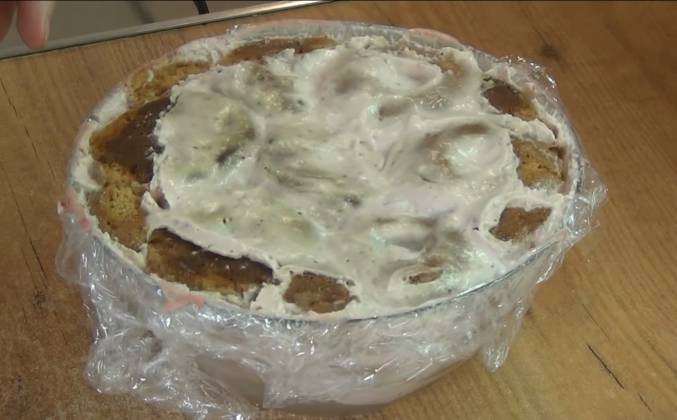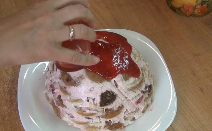 3. Отправляем его пропитываться в холодильник на 3-4 часа, лучше на ночь. Торт настаивался в холодильнике всю ночь. Убираем тарелку. Её можно облизать. Берём тарелку для торта. Накрываем, переворачиваем и достаём торт из миски. Аккуратно снимаем плёнку. Торт уже готов! Сверху его можно украсить измельчёнными орехами, тёртым шоколадом или ягодами. Я полью сверху перетёртой с сахаром клубникой. Готово!Видео рецепт ютуб ниже 👇