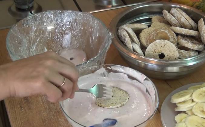 2. Начинаем составлять торт. Выстилаем пищевой плёнкой глубокую миску. Погружаем пряники в приготовленный крем. Выкладываем пряники в миску. На дно миски мне понадобится 3 пряника. Выкладываем слой бананов или других фруктов и ягод. Так чередуем слои: пряники с кремом - бананы. Сверху торт накрываем тарелочкой.