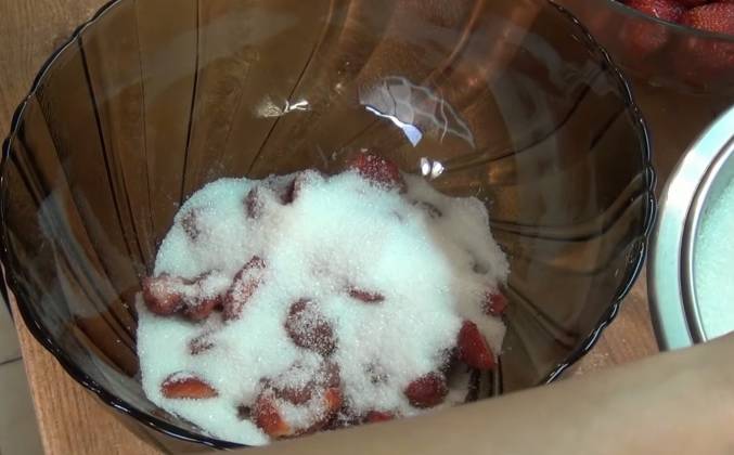 2. Оставляем так на 20-30 минут. Ждём, когда клубника даст сок. У меня в стеклянной миске сок будет виден. Клубника постояла и дала сок. Видно, что снизу потемнело. Аккуратно перемешиваем. Клубника ещё не осела. Оставляем снова на 20-30 минут. Снова перемешиваем клубнику. Выделилось много сока. Хорошо перемешиваем. Перемешивать нужно ещё 3-4 раза. Пока полностью не растворится сахар. Пока готовится клубника, стерилизуем банки и крышки.
