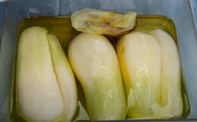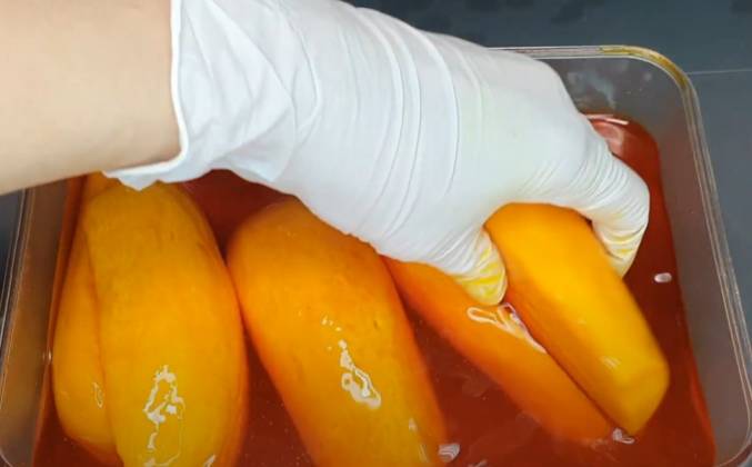 2. Оставляем на один день (на ночь) Складываем в контейнер, сок от редьки и немного воды(если нужно), плоды гардении, сложенные в одноразовый пакетик (они придают цвет).
