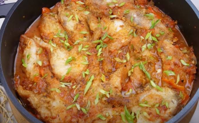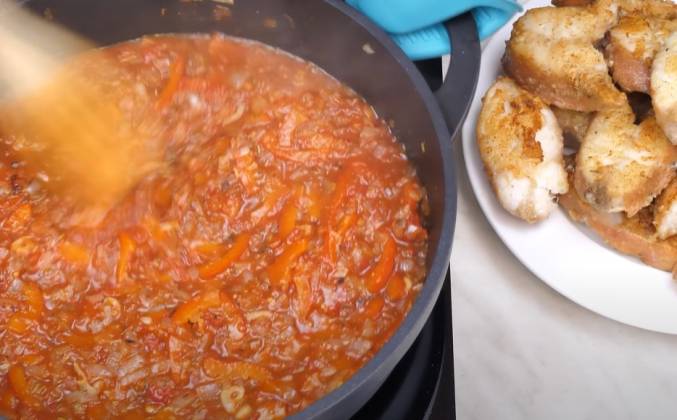 Как приготовить жаренную рыбу в томатном соусе с луком и перцем на сковороде рецепт от Коллекция Рецептов.