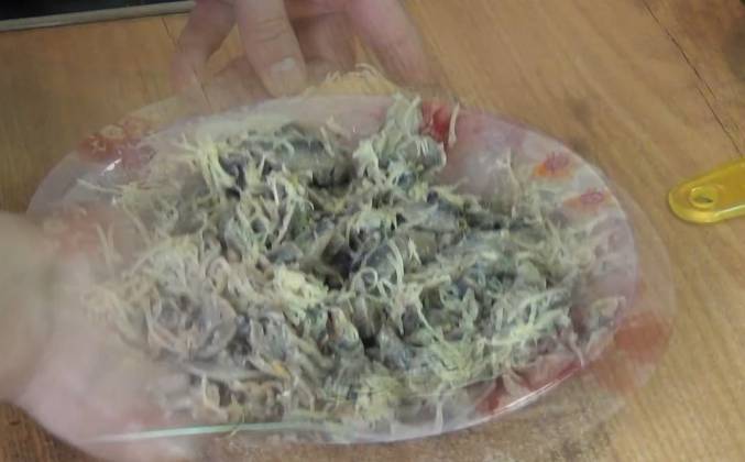 2. Готовим ещё пару минут. Добавляем соль и перец по вкусу. Сметану. Готовим ещё около 1 минуты. Отключаем нагрев. Добавляем цедру вымытого лимона. Пошёл приятный аромат. Хорошо перемешиваем. Перекладываем грибы в тарелку, чтобы быстрее их остудить. Добавляем к остывшим грибам натёртый на мелкой тёрке сыр и перемешиваем.