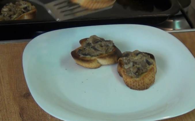 3. Поджаренные кусочки хлеба смазываем оливковым маслом. Сверху выкладываем начинку из грибов. Ставим бутерброды в хорошо разогретую духовку на 3-4 минуты. Кростини готовы! Сразу их перекладываем на сервировочную тарелку и подаём к столу. Начинки для кростини можно приготовить больше и хранить её в холодильнике в течение двух дней. Все эти два дня у вас будут свежие и вкусные кростини.Видео рецепт ютуб ниже 👇