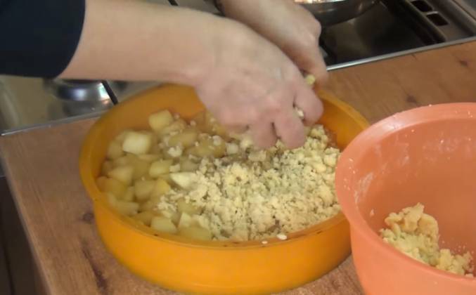 3.  Одна часть должна быть чуть больше второй. Большую часть перекладываем в форму для выпечки. Спрессовываем тесто в единое целое. У меня получился такой плотный блинчик. Берём горячую начинку. Выкладываем её поверх теста. Равномерно распределяем. Сверху посыпаем тестом. Ничего утрамбовывать не надо. Просто посыпаем тестом сверху. Ставим пирог выпекаться в разогретую до 170-180°C/350°F духовку. Пирог выпекается примерно 40-45 минут. Как только пирог зарумянился - сразу же достаём его из духовки. Оставляем его остывать. Давайте попробуем, что у нас получилось. Ещё горячий. Не утерпела, решила попробовать. Пирог получается сочным за счёт яблок. В то же время, это рассыпчатый пирог. Он идеально подойдёт к чаю или кофе.Видео рецепт ютуб ниже 👇
