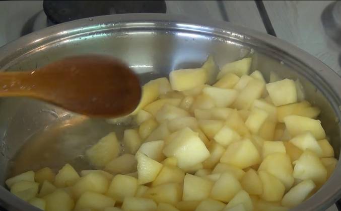 2.  Карамель уже темнеет на глазах. Берём очищенные и нарезанные яблоки. Яблоки лучше брать твёрдых сортов. Перемешиваем и ждём, когда яблоки станут прозрачными. Они отдадут свой сок. Яблоки пустили сок. Карамель стала жидким сиропом. Теперь надо уварить сироп, чтобы он снова стал карамелью. Тушим яблоки, периодически помешивая. Ждём, когда сироп станет вязким. Процесс приготовления яблок занял около 10 минут. Сиропа уже нет. Можно отключать нагрев. Отставляем начинку в сторону. Берём силиконовую форму для выпечки. Тесто нужно разделить на 2 части.