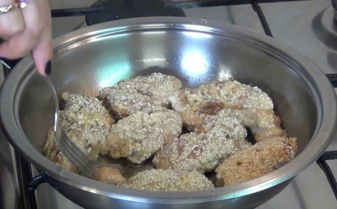 Кляр для курицы на сковороде из кунжута. Кунжут можно использовать не только в выпечке. А и для приготовления мясных и рыбных блюд. Давайте сегодня приготовим куриное филе в кунжуте. Для рецепта возьмём: 2 куриных грудки, 100 г кунжута, 5-6 ст.ложек муки, 5 ст.ложек соевого соуса, 1-2 яйца, 1 ч.ложку молотого имбиря, соль по вкусу и 4 зубка чеснока.