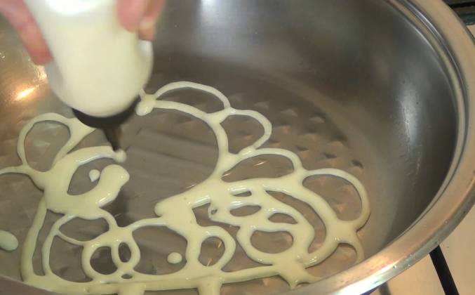 2. Можно использовать воронку. Закрываем. Нагреваем сковороду. Я её уже предварительно нагревала. Проверяем. Начинаем быстро рисовать кружева. Например, сердечко. Кружева. С носиком на бутылоке рисовать намного удобнее. Завитушки. Ждём, когда блинчик поджарится. Через 1-2 минуты блинчик можно переворачивать. Делаем это очень аккуратно, чтобы не порвать блинчик. Блинчик готов. Перекладываем его на тарелку. Теперь будем делать цветочек. Серединка. И лепестки. Такое занятие очень нравится детям.