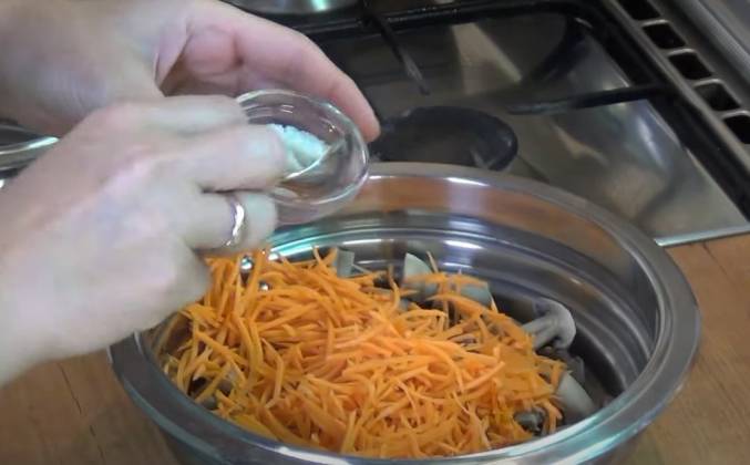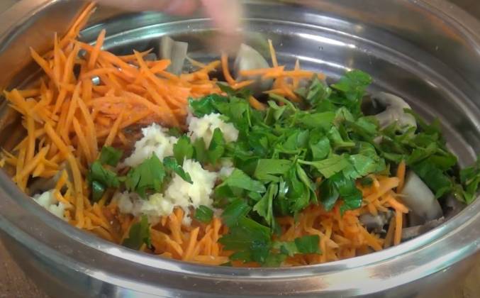 2. Натираем морковь на крупной тёрке или на тёрке для корейской моркови. Перекладываем морковь к остывшим грибам. Добавляем соль. Сахар. Уксус. Кориандр. Сюда можно добавить мускатный орех, молотый имбирь. Разогреваем растительное масло. Проверяем готовность масла: морковка шипит. Масло готово. Отключаем нагрев. Переливаем масло. Добавляем сюда чеснок. Выдавливаем его через пресс. Масло не льём на чеснок, потому что он может позеленеть. Нарезаем петрушку. Добавляем её в миску.