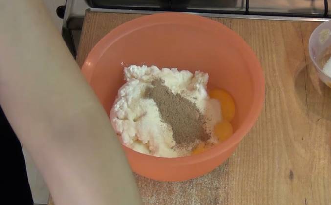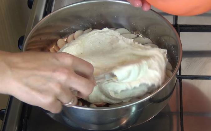 2. Я отключила нагрев, а карамель всё ещё готовится. Она уже стала тёмной. Красиво выкладываем яблоки прямо на карамель. Теперь делаем творожную массу. Берём большую ёмкость. Перекладываем в неё творог. Добавляем сахар. Яйца. Манку. Корицу. Кто корицу не любит, не добавляем корицу. Можно добавить другие любимые специи. Берём блендер. С многофункциональной насадкой. На первой скорости всё перемешиваем. Забыла добавить ванильный сахар. Перемешиваем лопаточкой. Получается однородная творожная масса. Хорошо перемешиваем. Ваниль придаёт приятный аромат, без неё никак. Творожную массу перекладываем в форму для выпечки. Выравниваем.