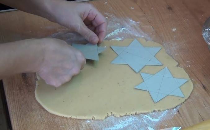 2. Может и хорошо прилипнуть. Берём пищевую плёнку. Заворачиваем тесто в плёнку и убираем на 1-2 часа в холодильник. Тесто постояло в холодильнике. Теперь из него можно формировать звёздочки. Звёздочки можно сделать при помощи специальных формочек для вырезки. Если этого нет, то нужно самим сделать звёздочки разного размера. Я их сделала из картона. Нарисовала и вырезала. Тесто разрезаем на 2 части. Посыпаем стол мукой и раскатываем тесто в лист толщиной 5-6 мм. Берём звёздочки. Располагаем их на тесте. Вырезаем ножом.