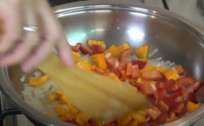 2. Распределяем тесто по форме. Растягиваем тесто и формируем бортики. Готово! У нас получилась такая корзиночка. Убираем тесто в морозильную камеру. В это время будем готовить начинку. Нагреваем сковороду вместе с растительным маслом. Нарезаем лук. Отправляем лук обжариваться. Режем перец кубиками. Лук стал прозрачным. Добавляем к нему перец. Перемешиваем и обжариваем до золотистости лука. Добавляем к овощам фарш. Соль. Перемешиваем и готовим до готовности фарша. В начинку можно добавить душистые травы, карри, чеснок - всё, что вам нравится. Готово! отключаем нагрев. Отставляем в сторону.