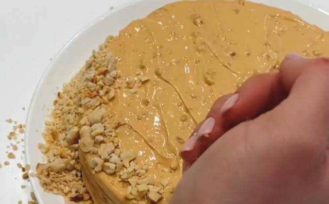 Далее смазываем верхний корж кремом и украшаем по бокам арахисом!