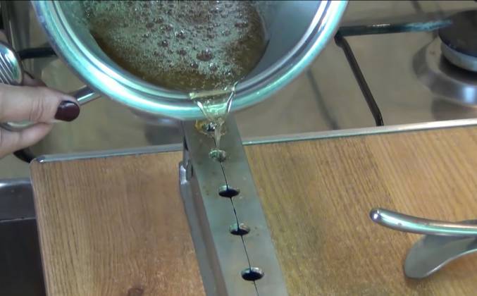 2. Добавляем лимонный сок. Включаем средний нагрев. Доводим до кипения, периодически помешивая. Сироп закипел. Убавляем огонь до минимального. Увариваем сироп до золотистого цвета. До цвета карамели. Проверяем готовность карамели. Берём карамель ложкой. Как тянется капелька. Капаем в холодную воду. Проверяем. Если она не мягкая, значит карамель готова. Звенит, как стёклышко. Можно делать леденцы. У меня получилась карамель янтарного цвета. Для получения более тёмного цвета, можно проварить ещё. В принципе, карамель готова. Берём форму. Заливаем в неё карамель. Сразу, пока карамель не застыла, вставляем палочки. Оставляем в таком виде карамель застывать.