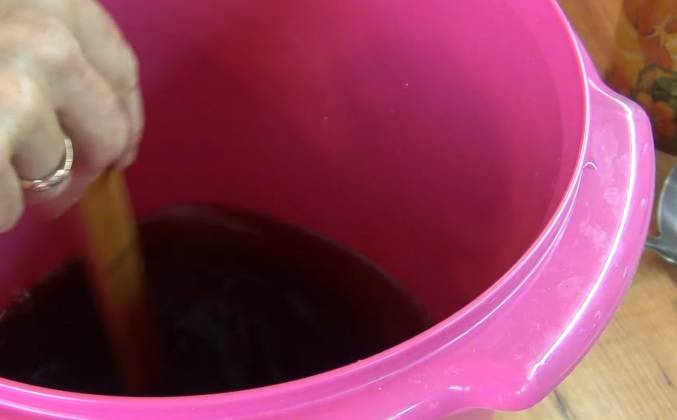 2. Отключаем нагрев. Делаем такой сироп. Его будет легче переливать в ведро. Можно ещё немножечко добавить. Получился вот такой сироп. Тёмный, как сусло. Переливаем его в ведро. Перемешиваем. Вода стала тёплой. Дрожжи уже подошли. Переливаем дрожжи в ведро. Накрываем марлей. Убираем в тёплое место на 2 дня. В процессе приготовления будем проверять на вкус. Квас у меня настаивался 2 дня. Я его периодически пробовала. Теперь процедим квас через марлю в бутылки. В каждую бутылку добавляем по 3 изюмины.