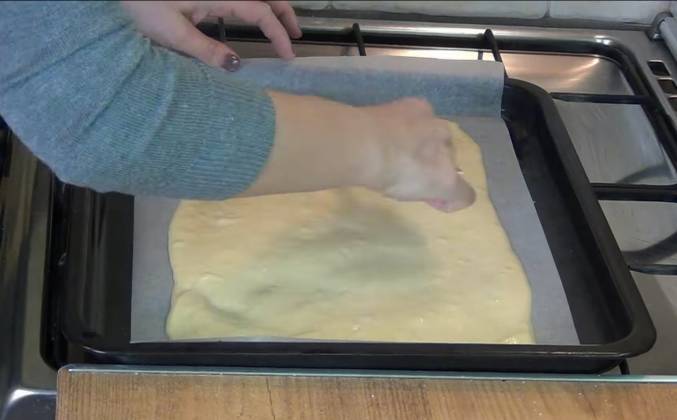 2. Разрыхлитель. Делаем это постепенно. Аккуратно перемешиваем вручную. Добавляем в тесто растительное масло. Аккуратно перемешиваем. Выливаем тесто на пергаментную бумагу. В миске ничего не оставляем. Выравниваем. Придаём форму прямоугольника. Готово! Ставим тесто выпекаться в разогретую до 200C/400F духовку. Через 5-6 минут бисквит готов. Всё очень просто и быстро. Оставляем на 2-3 минуты остывать. Самая простая начинка для рулета - варенье. Можно использовать сгущённое молоко, творожную массу, взбитые сливки, сметану с сахаром.
