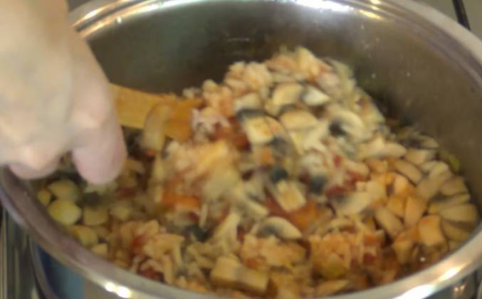 2. Перекладываем кусочки помидоров. Ещё раз хорошо перемешиваем. Добавляем соль. Перец по вкусу. Перемешиваем и обжариваем 3-4 минуты. Рис нужно постоянно помешивать, чтобы он не прилипал ко дну кастрюли. Заливаем холодной водой. Вода должна полностью покрывать рис и быть выше на палец. Накрываем крышкой. Убираем огонь на минимальный. Я буду готовить по термоконтроллеру: жду, когда стрелка дойдёт до середины зелёного поля. В обычной кастрюле варим до готовности риса. Стрелка термоконтроллера дошла до середины зелёного поля. Отключаем нагрев. Оставляем настаиваться на 15 минут. Открываем крышку. Хорошо перемешиваем начинку. Можно уже и так есть.